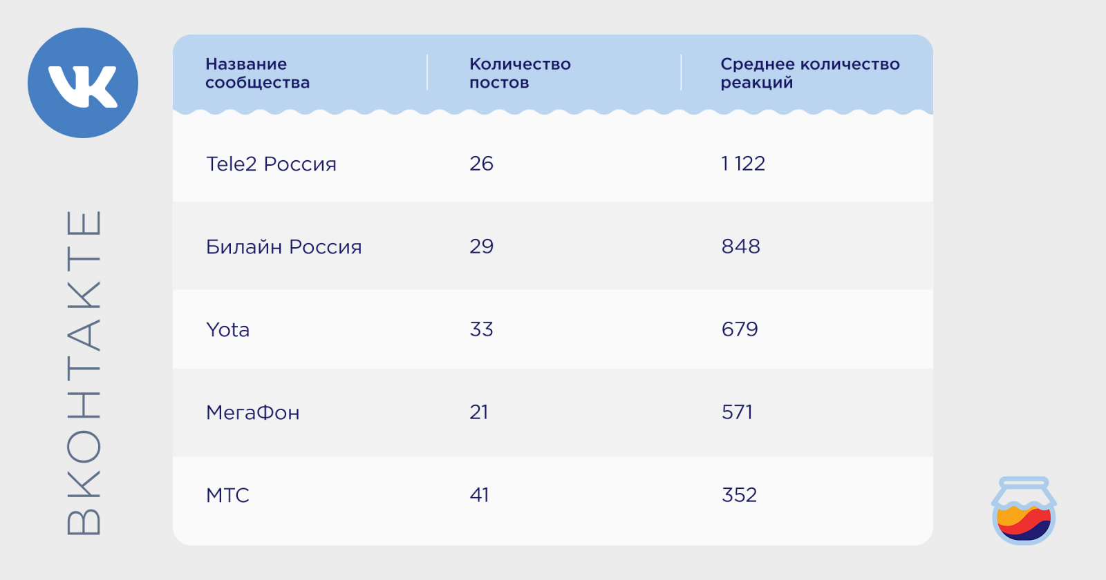 Казалось бы, этот перечень легко расширить, включив туда виртуальных операторов, например, «Тинькофф мобайл» или «Сбермобайл», быстро набирающих популярность. Но их активность в соцсетях, как показал анализ JagaJam, крайне мала. И это неудивительно. Виртуальный оператор продает услуги сотовой связи в качестве дополнительной услуги клиентам, которым они уже продали свой основной продукт. Зачем тратиться на привлечение клиентов, если они уже есть?