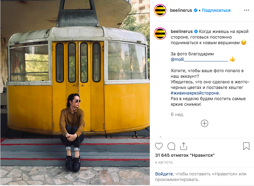 Механики довольно стандартны (надо прислать свои фото в «пчелиной» стилистике бренда), но это работает. Маркетологи «Билайн"а используют все три основных вида контента: не только Hub и Help-контент, но и Hero.
