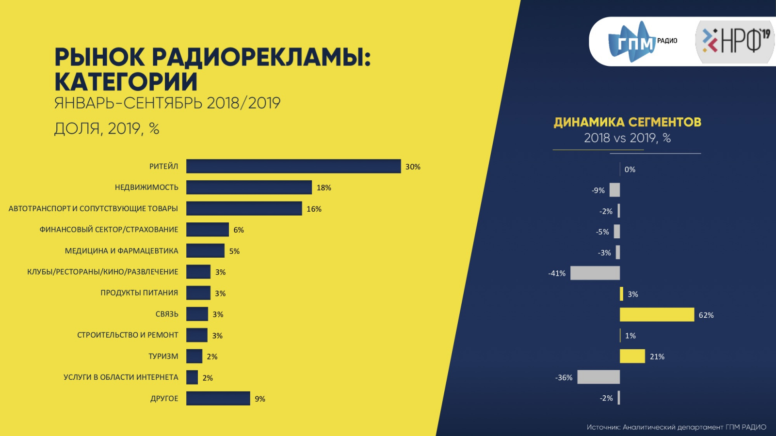 Кто же размещается на радио в эпоху диджитальной трансформации? По итогам первых девяти месяцев этого года в сравнении с аналогичным периодом прошлого на первом месте остается ритейл, на второй и третьей позициях произошла рокировка: категория автотранспорт, долгое время занимавшая второе место, уступила недвижимости. На рынок радио, включая и регионы, приходят новые рекламодатели.