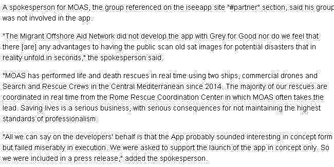 Любопытнее всего, что указанная в качестве партнера некоммерческая организация MOAS, под патронажем которой якобы реализовывался весь проект, не имела к нему никакого отношения. Во всяком случае, об этом заявил официальный представитель организации, отметив при этом, что не видит вообще смысла в подобном изобретении.