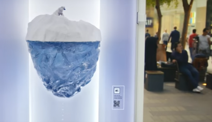 Агентство Ogilvy & Maher (Сингапур) создало для австралийского Гринписа интерактивную инсталляцию в Сиднее. Кусок льда, напоминающий айсберг, медленно тает на глазах у прохожих. На вершине айсберга – маленький полярный медведь. Однако если считать QR-код на инсталляции, капельки воды медленно потекут обратно в айсберг. Остановить глобальное потепление и спасти медведей еще не поздно, уверены в Гринпис.