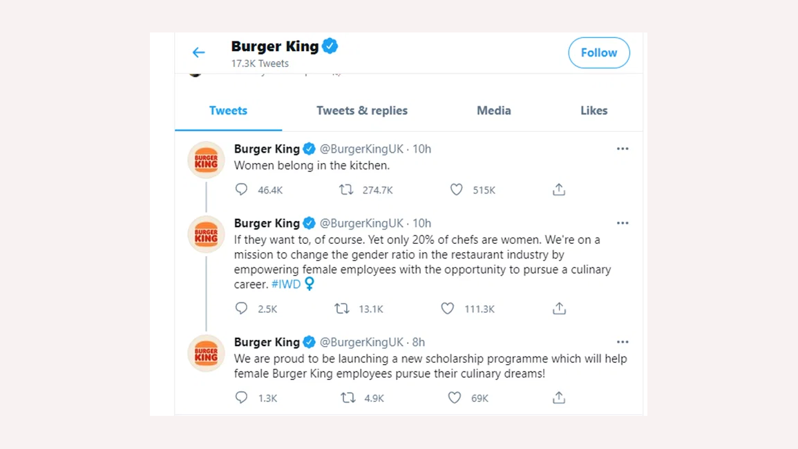 «Место женщины — на кухне!» — так решил поздравить женщин с 8 марта на своем аккаунте в Twitter известный своими шутками бренд-провокатор Burger King. Реакция не заставила долго ждать: десятки пользователей отреагировали негативно на этот твит, некоторые из них даже поклялись больше не покупать еду в ресторанах компании.