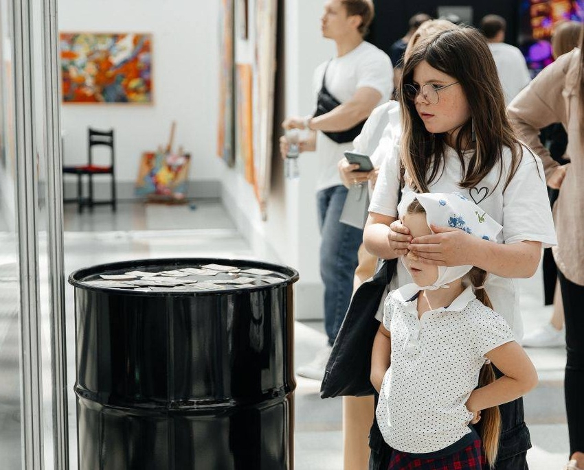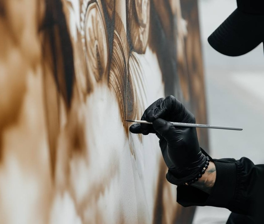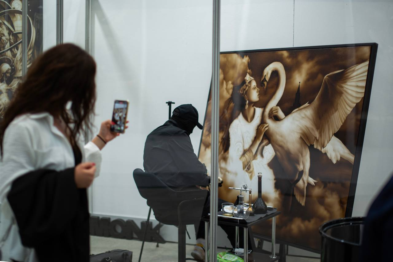 На площадке фестиваля мы построили прозрачный закрытый куб, где проходил сам перформанс. В зоне автора стоял мольберт, мини-столик для инструментов и специальный очиститель воздуха. Рядом разместили выставочную зону с готовыми работами. Часть картин были намеренно скрыты под черными полотнами — чтобы увидеть их, нужно было перейти по QR-коду на сайт художника. Эта механика повысила вовлеченность и увеличила трафик на сайт (+100% к посещениям).