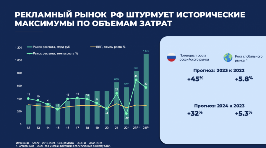 «Несмотря на потерю в 2022 году возможности размещения рекламы в ряде охватных интернет-ресурсов, объём инвестиций в продвижение в цифровой среде в 2023 году показал максимальный относительный рост за последние годы. Эта тенденция продолжится и в 2024 году», — прогнозируют в Group4Media.