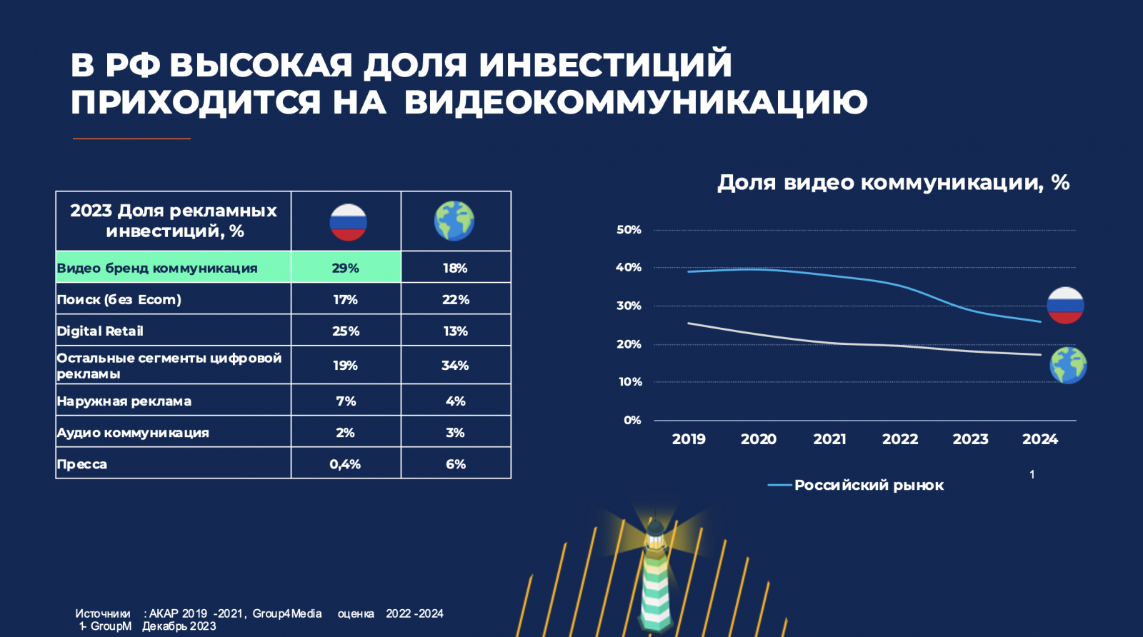 Там добавляют, что от глобального российский рекламный рынок отличает «высокая доля инвестиций, приходящихся на видеокоммуникацию». ТВ остаётся основным видеоканалом и достаточно успешно сохраняет свои позиции в России.