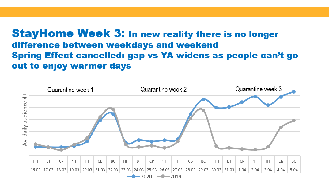 Еще пару месяцев назад никто не мог рассчитывать на такую уникальную возможность обратиться сразу ко всей стране. Прямо сейчас мы видим, что стирается грань между буднями и выходными — график телесмотрения выровнялся.