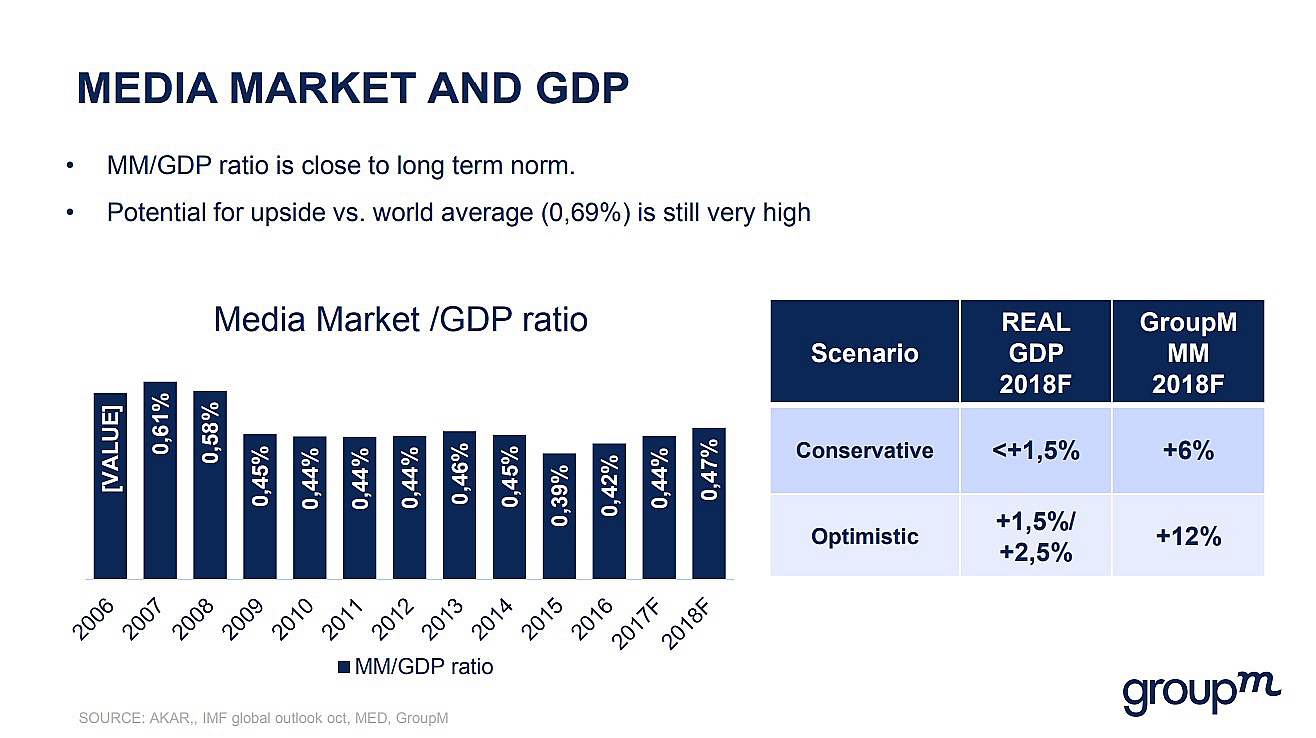 Рекламная группа GroupM представила прогноз по развитию российского рекламного рынка в 2018 году. Согласно консервативному прогнозу (при росте ВВП России менее 1,5%), рекламные бюджеты увеличатся на 6%, оптимистичному (при росте ВВП на 1,5–2%) – на 12%, сообщила заместитель генерального директора GroupM Мария Колосова на конференции This Year, Next Year «Погоня за контентом» во вторник, 28 ноября.