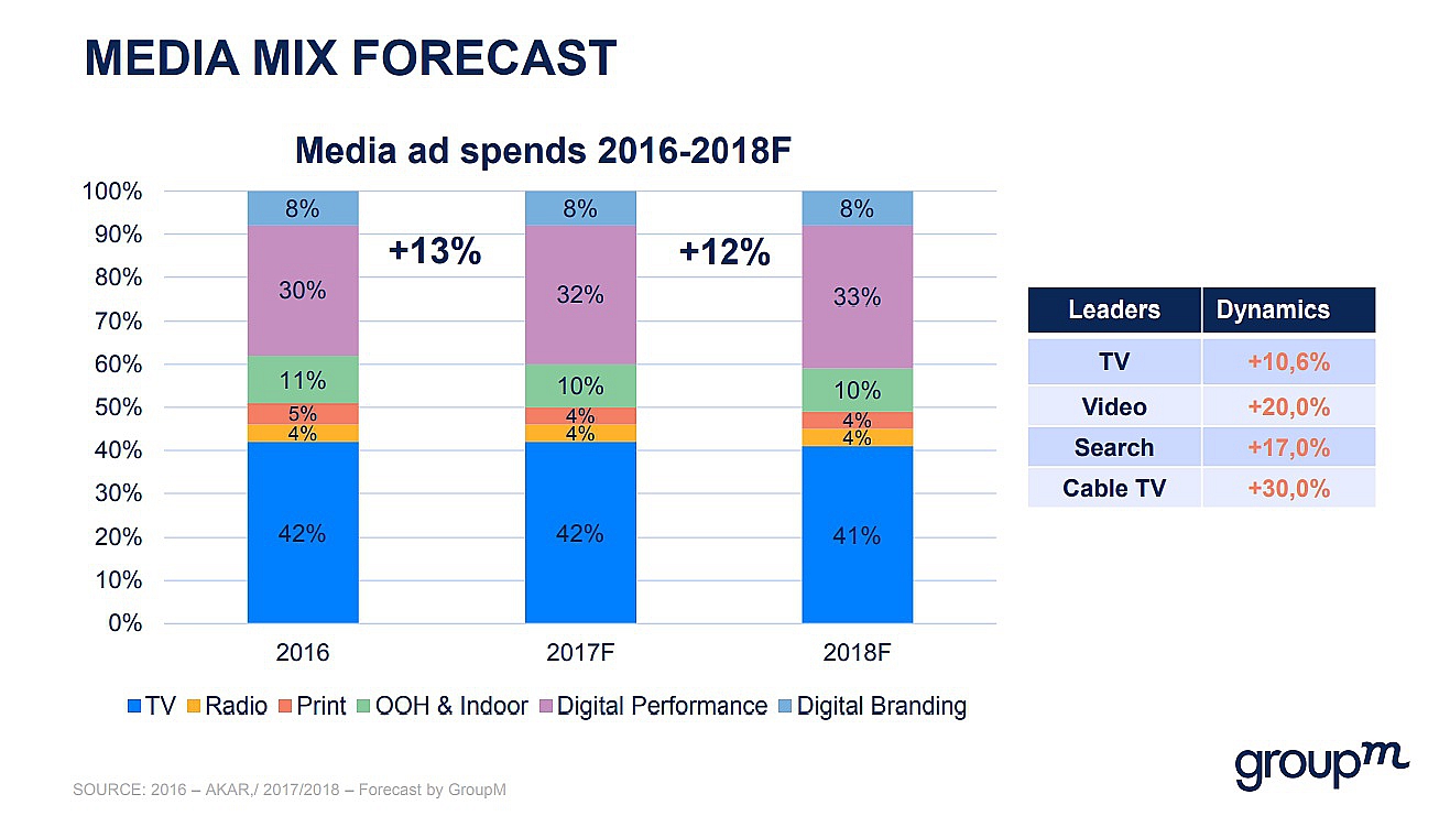 По прогнозам GroupM, доля телевидения на рекламном рынке в 2018 году сократится на один процентный пункт с 42% до 41%, интернета (только Performance) увеличится с 32% до 33%. Для сравнения доля ТВ на глобальном рекламном рынке равняется 39%, самая низкая она в Восточной Европе – 28%. Доли остальных каналов в медиамиксе останутся прежними в следующем году: наружная реклама – 10%, Digital Branding – 8%, радио и пресса – по 4% каждый.