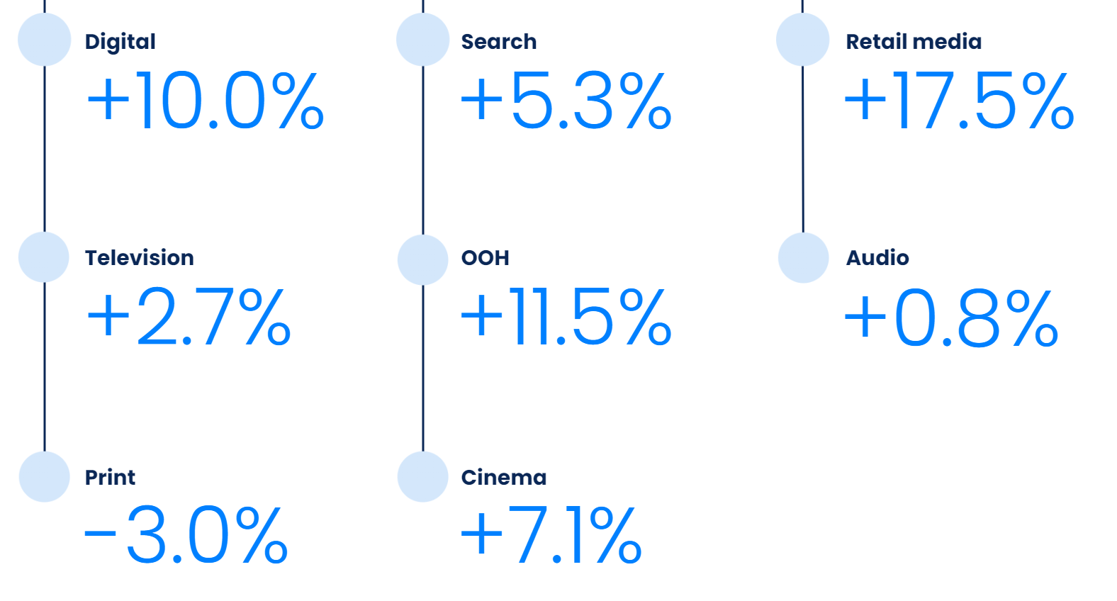 Самый большой рост рекламного рынка ожидается в Китае, где рекламные расходы вырастут на 14% и составят $199,4 млрд. Рынок Бразилии прибавит 11,3%, Индии — 9,5%, Франции — 8,6%. В США рынок увеличится на 5,8%, до $365,9 млрд. Китай и США совместно займут 57% всего глобального рынка рекламы (без учёта России).