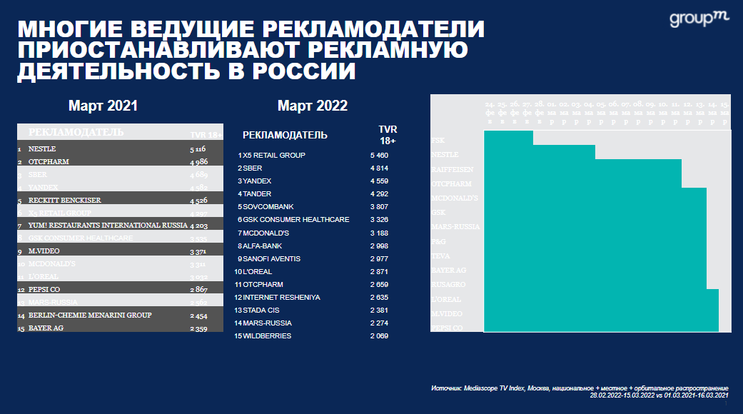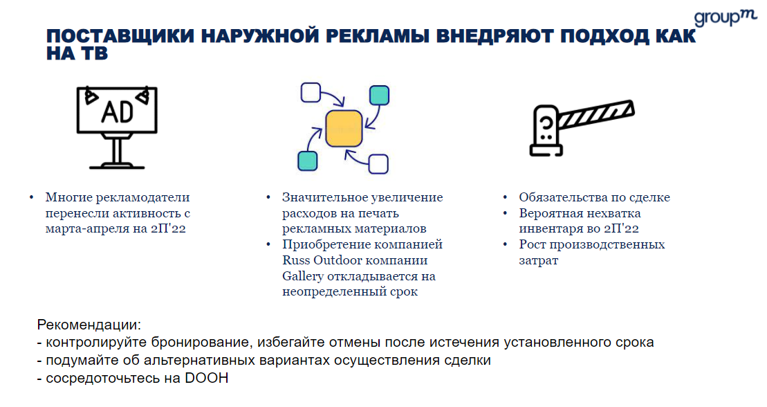 В целом отмечено снижение рекламной активности на телевидении на 34% — это связано с уходом с российского рынка ряда крупных рекламодателей. Поставщики наружной рекламы также сдвинули запланированную активность с марта-апреля на вторую половину 2022 года. В сегменте отмечен рост цен на печать и вероятный дефицит инвентаря во второй половине года.