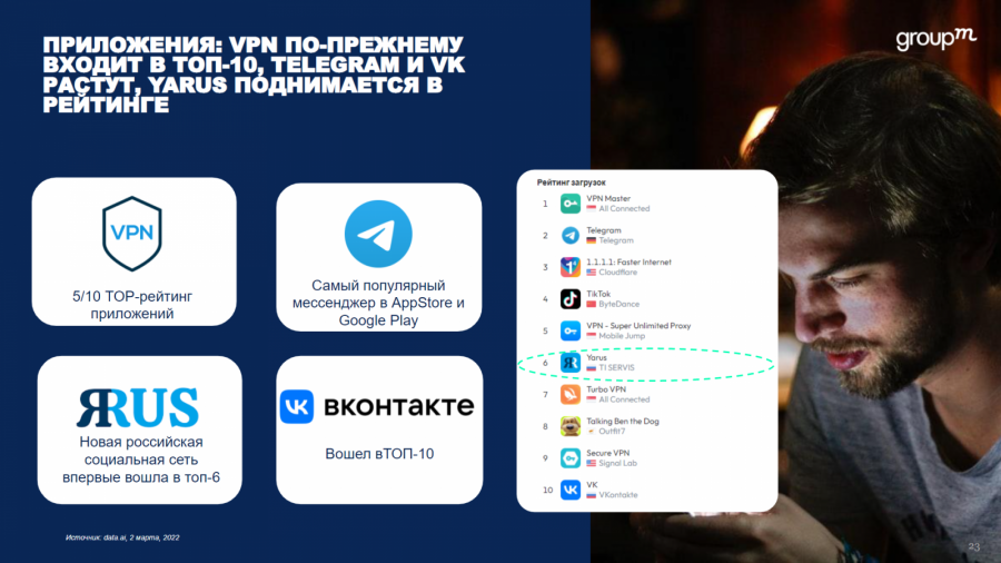 VPN-сервисы лидировали по скачиваемости, также в топ приложений вышла российская соцсеть «ЯRUS», а Telegram стал самым популярным среди мессенджеров в App Store и Google Play.