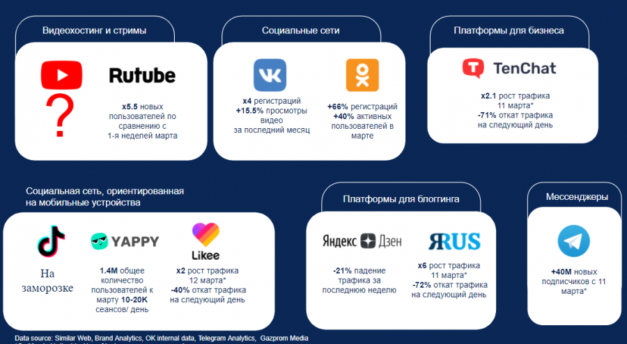 Среди мессенджеров и соцсетей наблюдается рост трафика у Telegram, VK и «Одноклассников». Мессенджер WhatsApp (принадлежит компании Meta, признанной экстремистской на территории России, её деятельность запрещена) сохраняет стабильный пользовательской посещаемости.
