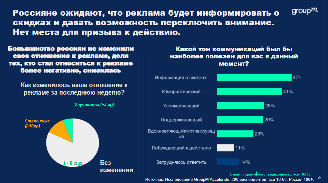 На фоне инфляции также отмечен рост доверия к рекламе. 47% россиян ожидают, что она будет информировать их о скидках и акциях, 41% — что она их развеселит, по 29% — что успокоит и поддержит, 23% — что вдохновит. Всего 11% опрошенных ожидают побуждения к действию.