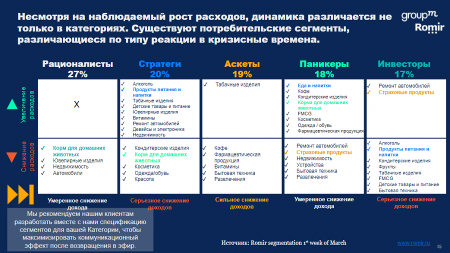 Потребителей разделили по категориям в зависимости от поведения в кризис. На первой неделе марта около 27% оказались «рационалистами», 20% — «стратегами», 19% — «аскетами», 18% — «паникёрами» и 17% — «инвесторами».