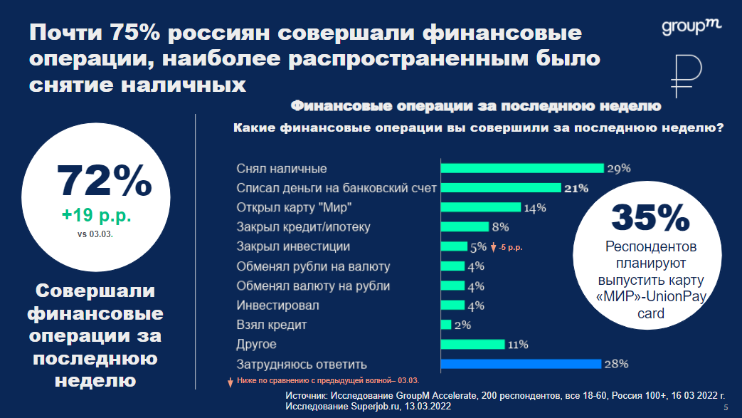 72% россиян совершали финансовые операции: обналичивали деньги (29%), списывали средства на банковский счёт (21%), открыли карту «МИР» (14%), закрывали кредит или ипотеку (8%) и выполняли другие действия. Число тех, кто регулировал свои финансы, выросло на 19 п.п. за последнюю неделю по состоянию на 16 марта по сравнению с предыдущей волной — 3 марта.