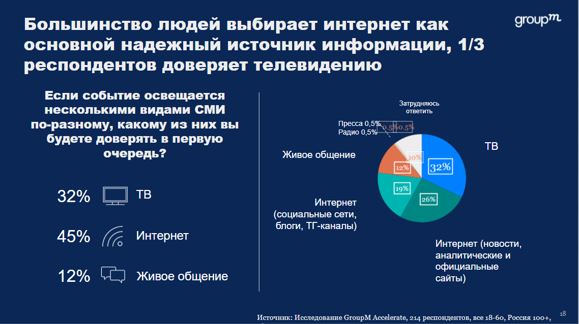 Самым популярным источником информации оказался интернет: аналитика, новостные медиа, соцсети, блоги и Telegram-каналы. При этом около трети (32%) респондентов доверяют телевидению, а 12% узнают новости из живого общения.