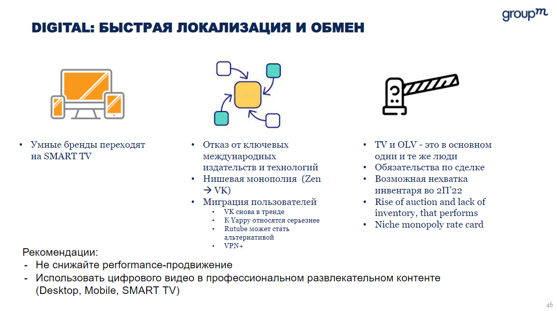 Сегмент e-commerce в GroupM назвали «тихой гаванью» рекламных бюджетов. Продвижение там безопасно для бренда, так как на неё не действуют правила рекламы в СМИ, но при этом охваты рекламы на главных страницах маркетплейсов сравнимы с баннерами на главной «Яндекса».