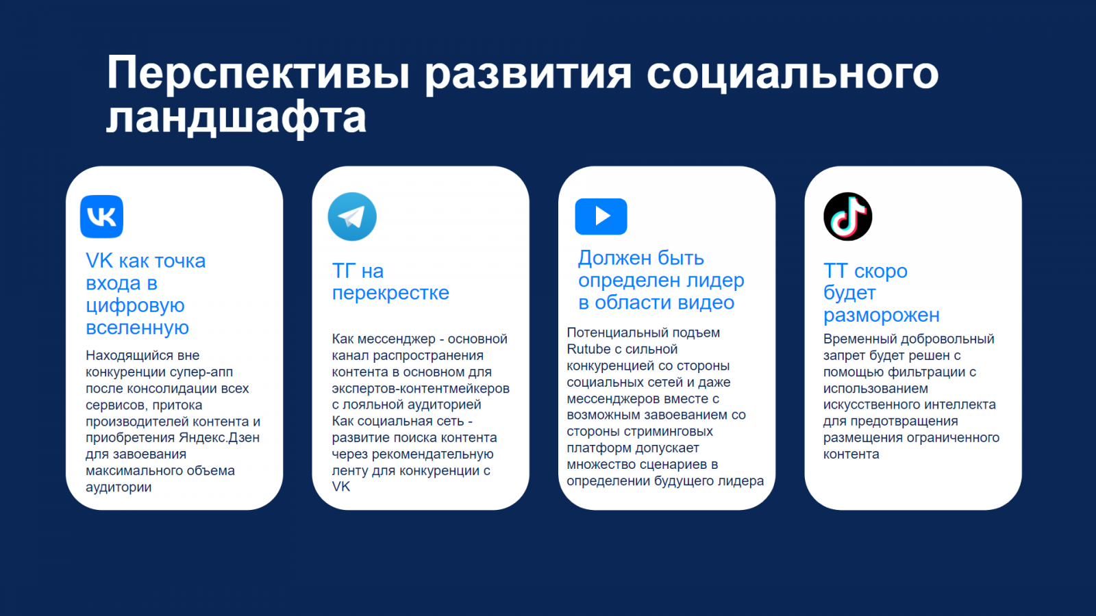 В GroupM также составили прогноз дальнейшего развития диджитал-площадок. Эксперты полагают, что VK и Telegram укрепят своё лидерство на рынке платформ для распространения контента, а TikTok будет разморожен.