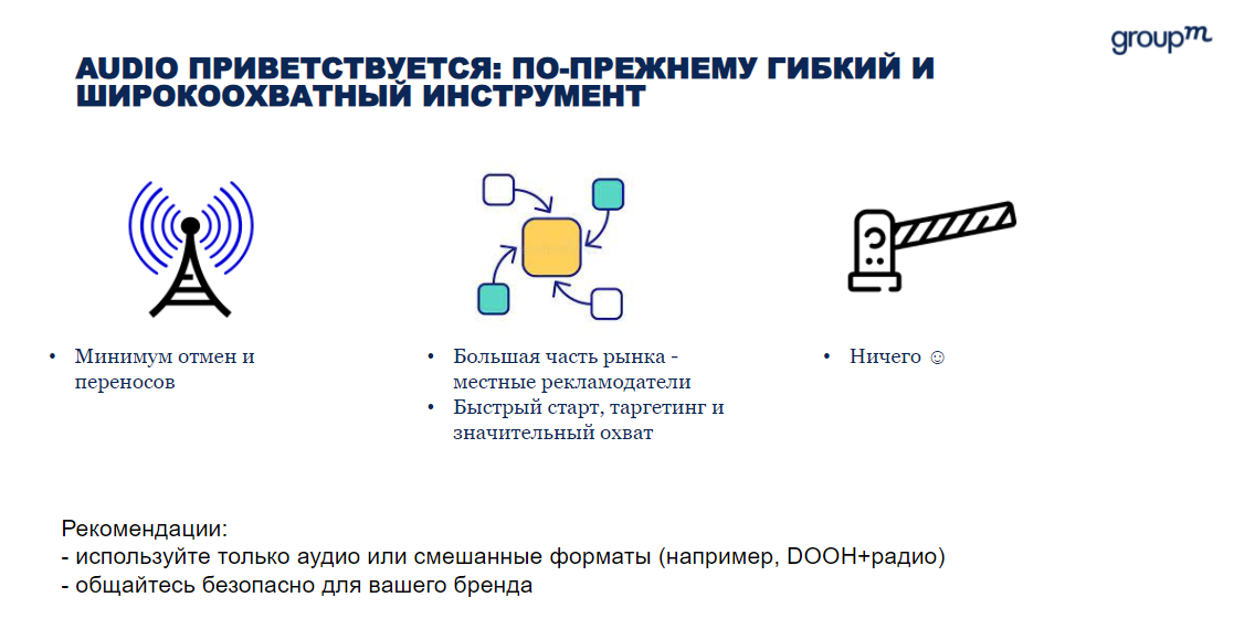 В аудиорекламе эксперты не заметили больших изменений. В GroupM формат назвали по-прежнему гибким и высокоохватным инструментом продвижения.