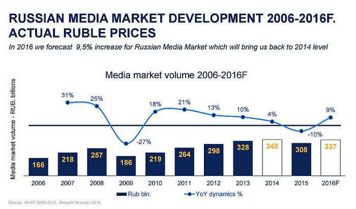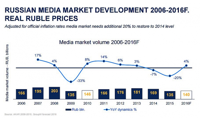 Если же очистить темпы роста от инфляционного компонента, то они составят всего 4% по итогам года, продолжает Туровец: "Мы приближаемся в рублях, очищенных от инфляции, всего к 2010 году (146 млрд руб. – данные агентства). За 6 лет, по большому счету, ничего не изменилось с точки зрения денег, инвестированных в рекламу". По расчетам GroupM, реальный объем рекламного рынка в этом году составит только 140 млрд рублей против 135 млрд в 2015 году и будет на 20% ниже уровня докризисного 2014 года.