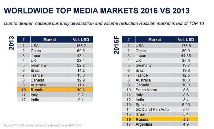 "Есть второй момент – в долларовом эквиваленте за последние 10 лет мы ничего не достигли, а только потеряли: в 2006 году мы были рынком в $6 млрд, сейчас - $5,3 млрд", - добавил директор по закупкам GroupM. По данным агентства, сейчас Россия занимает лишь 16-ое место по объему рекламного рынка в мире, хотя в 2013 году российский рекламный рынок ещё входил в международный ТОП-10.