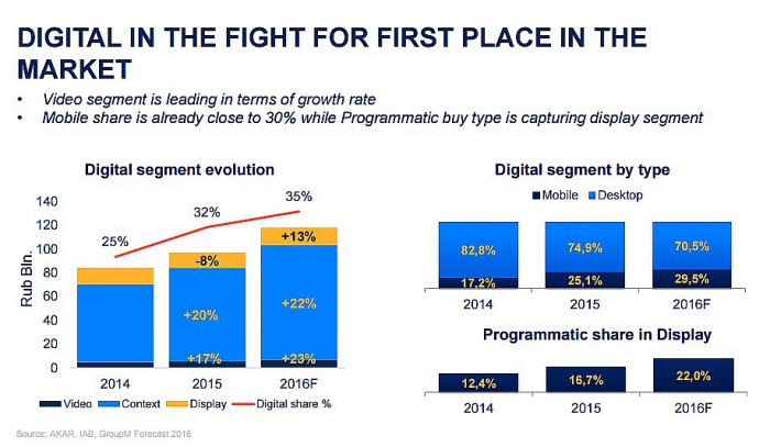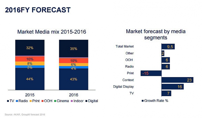 Вместе с телевидением основным драйвером роста рекламного рынка останется интернет. В этом году digital-сегмент вырастет на 22% и составит 118 млрд рублей, но в 2017 году, по прогнозу GroupM, его темпы роста замедлятся до 17%. Внутри сегмента главной остается контекстная реклама, на которую приходится больше 2/3 всей интернет-рекламы, говорят в агентстве. В этом году она вырастет на 23%, в следующем – на 17%. Медийная реклама после прошлогоднего падения на 8% вырастет по итогам 2016 года на 13%. Оценку по этому сегменту на следующий год GroupM пока не представило.