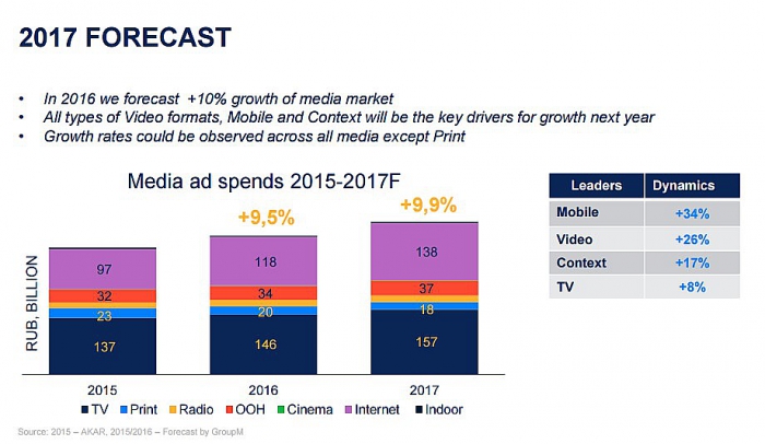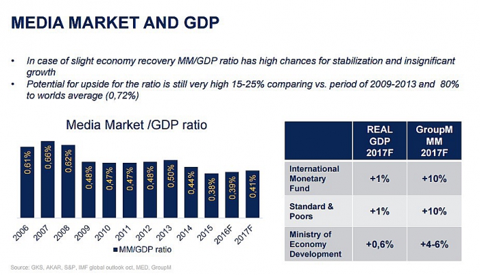 Несмотря на его пессимизм, официальный прогноз GroupM на 2017 год предполагает рост рекламного рынка в России на 10%. В текущем году темпы роста, по последним расчетам агентства, составят 9,5%, хотя в октябре прошлого года GroupM прогнозировала лишь 2-процентный рост рынка в 2016 году. Менее оптимистичными среди представителей агентского бизнеса были прошлогодние прогнозы ZenithOptimedia – 0,7% и Carat – 0,2%. В марте Zenith улучшил прогноз на 2016 год до 2,3%, Carat пересмотрел его в сентябре, до 6,2%.