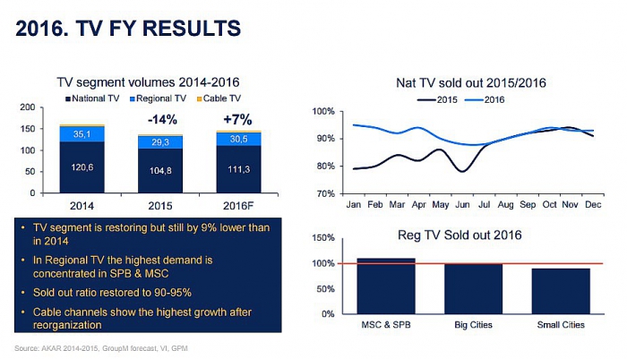По итогам 2016 года объем телерекламы в стране вырастет на 7%, до 146 млрд рублей. По словам Марии Колосовой, примечательной оказалась первая половина года: "Мы действительно можем сказать, что спрос стабилизировался, так как в первой половине 2015 года не весь инвентарь был продан и не все верили, что в эту страну можно инвестировать".