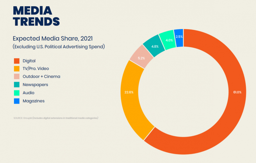 Доля диджитал-рекламы в медиамикесе в 2021 году может составить 61% глобально. Она удвоилась с 2015 года, когда составляла только 30,6%. В GroupM считают, что к 2024 году доля диджитал-рекламы в мировом масштабе вырастет до 66%.