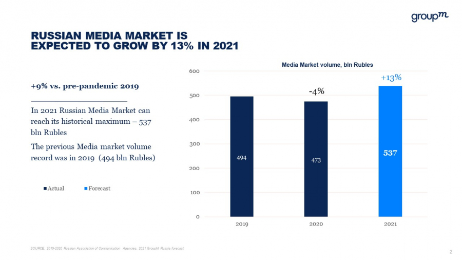 Ранее GroupM прогнозировала рост рекламного рынка на 12,3%. Эксперты подняли свою предыдущую оценку — она составляла 8,2%. Это стало возможно благодаря устойчивости digital-рекламы к пандемии.