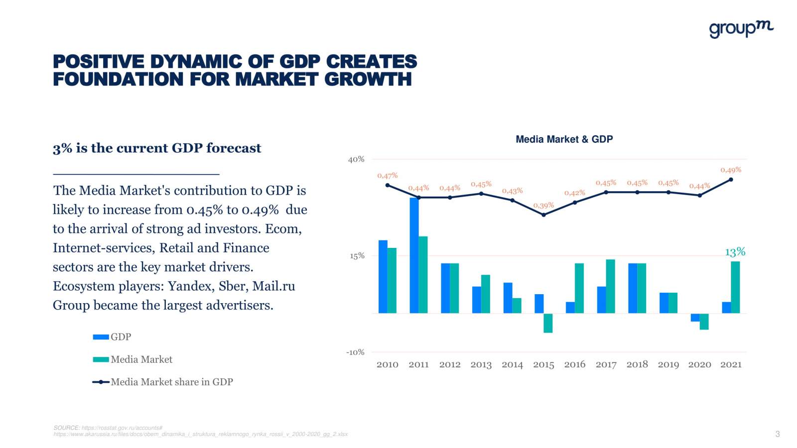 Международная рекламная группа GroupM представила прогноз развития рекламного рынка в 2021 году (есть в распоряжении Sostav). По оценке холдинга рынок покажет существенную положительную динамику. При росте ВВП расходы на рекламу могут увеличиться на 13%, примерно до 530−540 млрд руб., заявила CEO GroupM Мария Колосова.