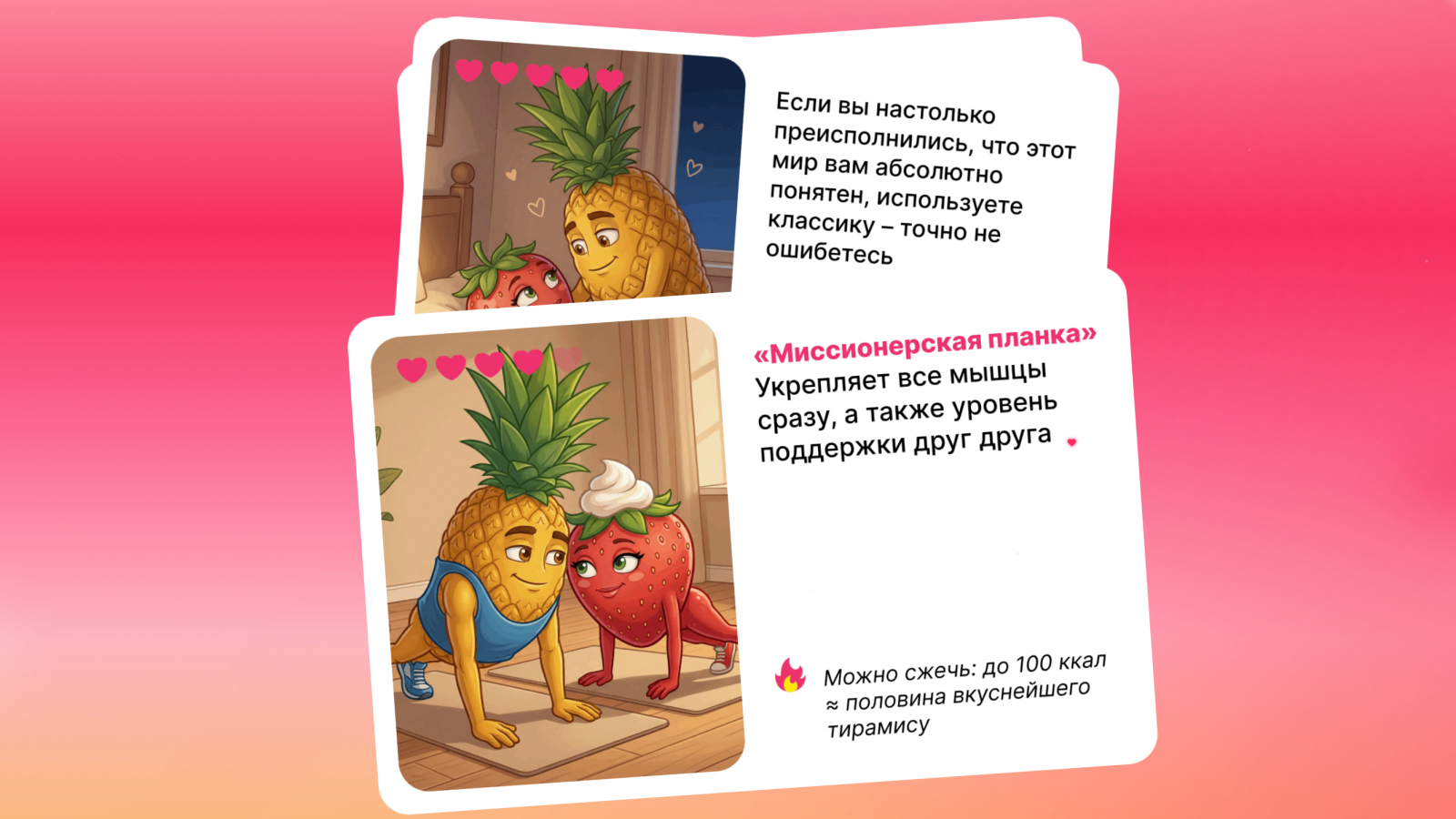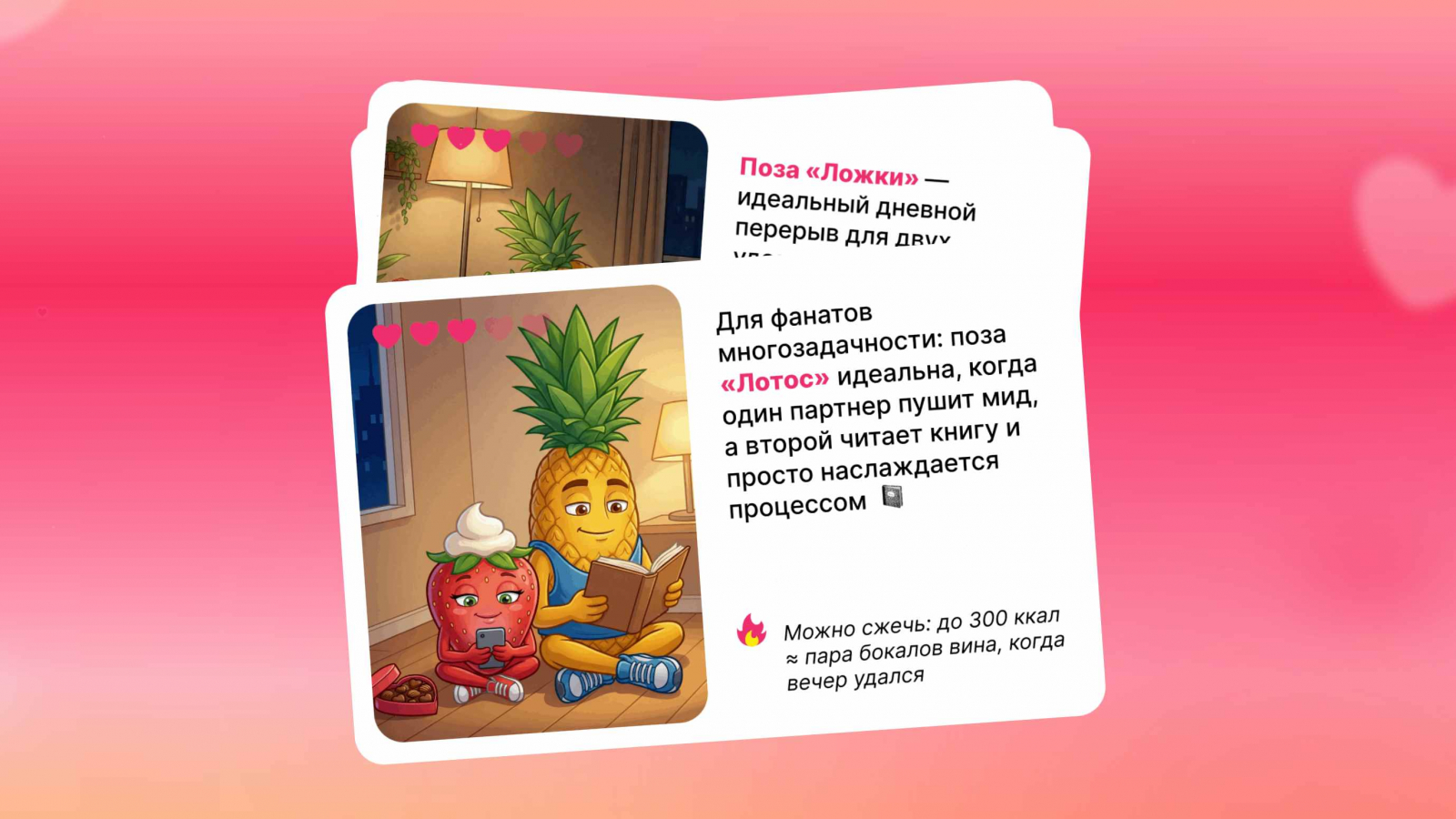 Упражнения рассчитаны на разный уровень интенсивности — от расслабляющих «Ложек» до экстремального «Шотландского штурвала». Особое внимание уделено позе «Миссионерская планка», которая прорабатывает все группы мышц и усиливает поддержку партнера.