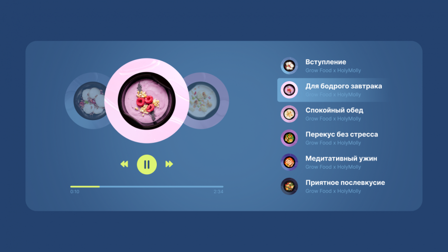 Динамика треков подобрана по нарастающей: утро начинается энергично, обед и полдник проходят бодро, а ужин завершается спокойно. Перед каждым миксом пользователи услышат медитативные аффирмации, помогающие настроиться на прием пищи.