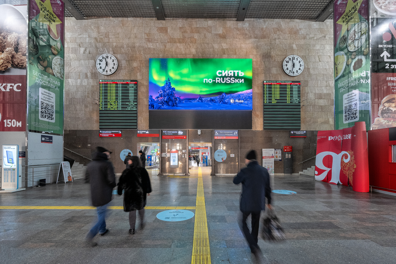 Группа Russ установит большие цифровые экраны на Ленинградском вокзале в Москве и Московском вокзале в Санкт-Петербурге. Один из экранов — размером 8×4 метра — уже размещён на Ленинградском вокзале, в ближайшее время на Московском вокзале будет установлен экран размером 16×3 метра, сообщили Sostav в компании.