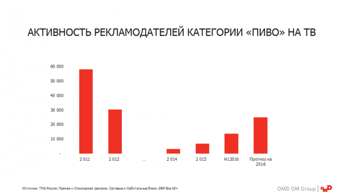 И лишь в 2016 году мы увидели серьезную активизацию пивных рекламодателей на ТВ – это связано как восстановлением относительной стабильности в экономике (а значит - с более длительным горизонтом планирования), так и с достойным списком крупных спортивных событий (ЧМ по хоккею в Москве, ЧЕ по футболу во Франции, Летние Олимпийские игры и др).