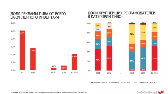 До запрета рекламы пива в 2012 году Carlsberg Group был абсолютным лидером категории с долей около 50%. В 2014-2015 году традиционный лидер не проявлял заметной активности, но в 2016 вновь уверенно захватил более 50% доли в эфире.