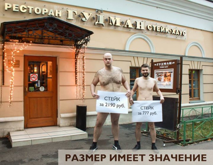 «Гудман» принял вызов и наглядно объяснил, почему его стейки стоят дороже. Ресторан подчеркнул, что цена зависит от качества мяса. Разницу между альтернативными стейками и стейками с высокой мраморностью демонстрируют два обнаженных мужчины.