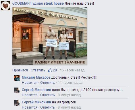 «Форма подачи информации выбрана сознательно с юмором, схожая с вызовом, который нам бросили. GOODMAN всегда будет местом, где профессионально готовят стейки из лучшего мяса. Это аксиома», - парировала команда заведения.