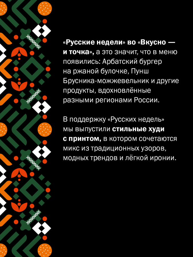 В конце ноября во «Вкусно — и точка» стартовали «Русские недели» — в меню появились блюда, вдохновленные кухнями разных уголков России. Чтобы поддержать проект, бренд выпустил капсульную коллекцию мерча, доступную только на Ozon.