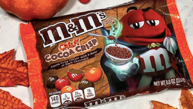 Хрустящее драже от M&M's покрыто слоем темного шоколада и коричневой, оранжевой или красной оболочкой — типичными для Хэллоуина оттенками. На упаковке драже Красный облачился в костюм вампира.