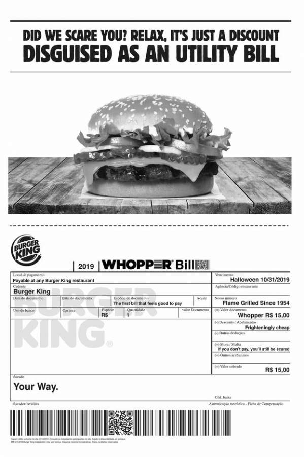 Burger King напугал бразильцев фейковым коммунальным платежом. 10 000 покупателям выслали купон на 50% скидку на Воппер в виде коммунального платежа. Жители Бразилии также могут найти онлайн-купон и отправить его своим друзьям в качестве розыгрыша.
