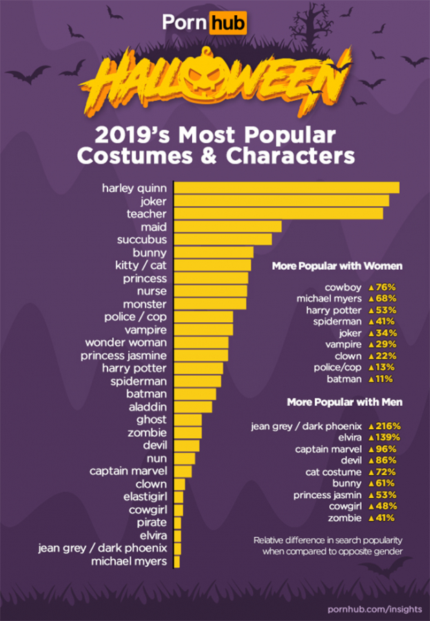 Pornhub назвал персонажей, с которыми пользователи платформы чаще всего искали порно накануне Хэллоуина. В этом году лидером запросов стала Харли Квинн, суперзлодейка из вселенной комиксов DC Comics. На втором месте — ее друг Джокер. Женщины чаще ищут ковбоя, Майкла Майерса и Гарри Поттера. А среди мужчин наибольшей популярностью пользуются Джина Грей, Капитан Марвел и принцесса Жасмин.