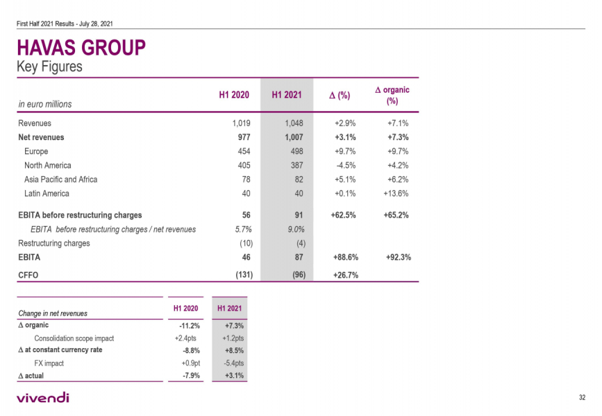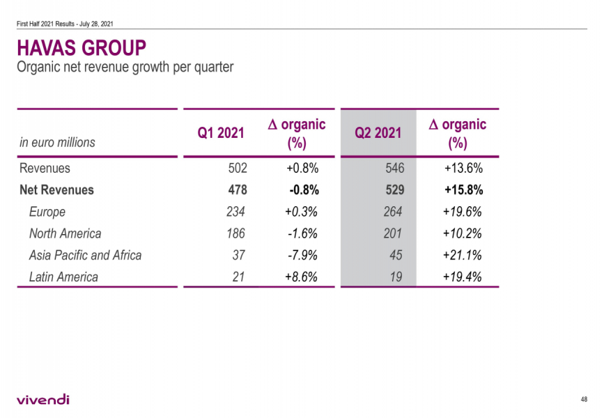 Havas Group (входит в Vivendi SA) представила финансовый отчет по итогам второго квартала и первого полугодия 2021 года. Общая выручка Havas Group в первом полугодии достигла €1,048 млрд, что в денежном выражении на 2,9% больше, чем годом ранее, и показала органический рост 7,1%.