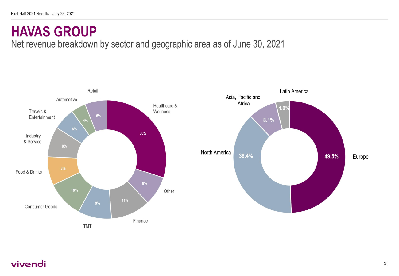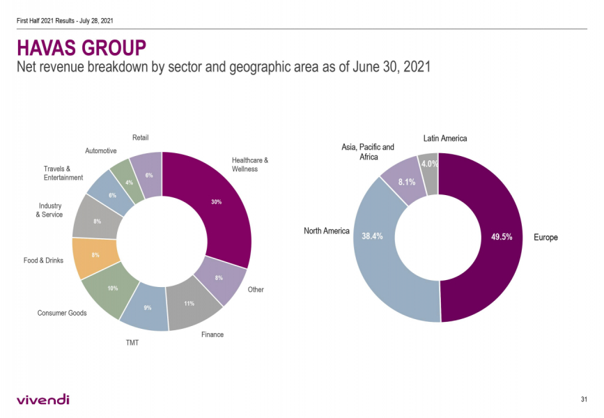 По состоянию на 30 июня 2021 года самым крупным сегментом компании является Helthcare & Wellness, который принес Havas Group 30% всей чистой выручки. Далее следует финансовый сегмент — 11% от чистой выручки.