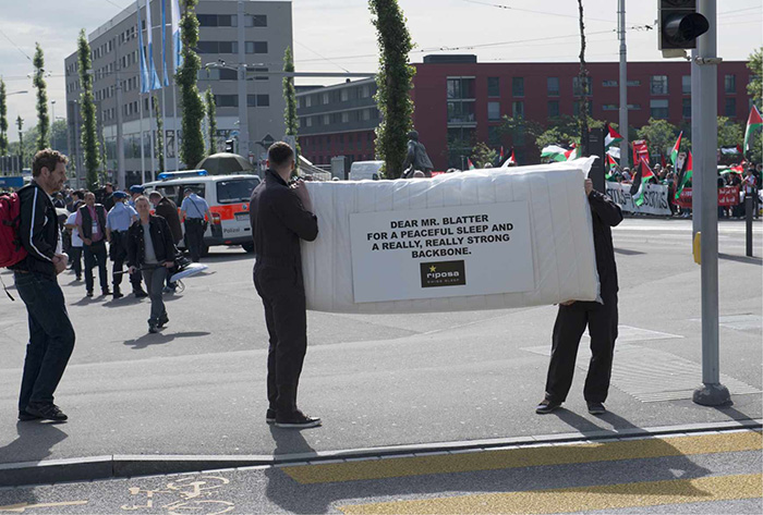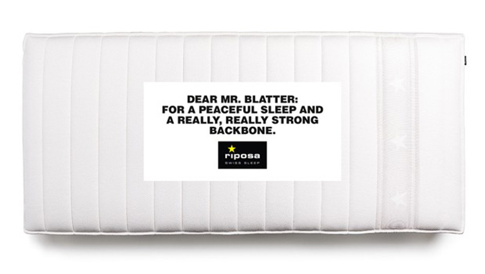 Смелое ироничное послание, написанное на матрасе Riposa, желало хорошего сна  Йозефу Блаттеру и гласило: «Уважаемому господину Блаттеру, для спокойного сна и по-настоящему крепкого стержня» (Dear Mr Blatter, for a peaceful sleep and a really, really strong backbone).