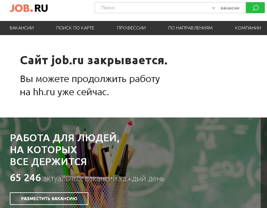 В ноябре стало известно, что совет директоров холдинга «Пронто медиа», в состав которого входит издание «Из рук в руки» и портал job.ru, принял решение закрыть свои активы, как убыточные. С начала этой недели на сайте job.ru уже появилось информационное сообщение о закрытии портала и предложении всем соискателям и работодателям присоединиться к проекту HeadHunter.