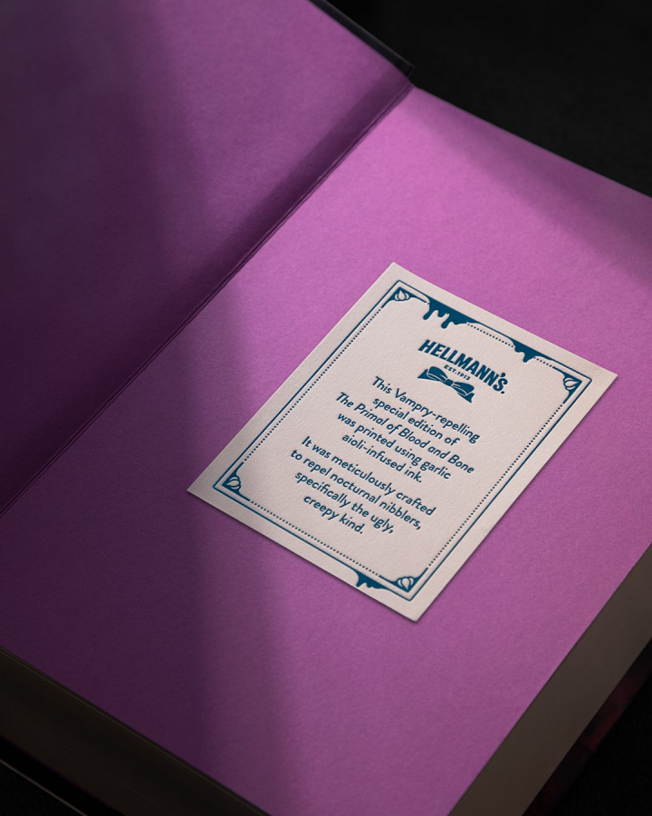 Книга напечатана специальными чернилами с ароматом чеснока, что, по задумке авторов, отсылает к одному из главных мотивов жанра — защите от вампиров и темных существ. Hellmann’s, известный своим майонезом с добавлением чеснока, использовал эту метафору как инструмент бренд-коммуникации: аромат стал частью литературного мира, в котором запах чеснока превращается в магический символ.