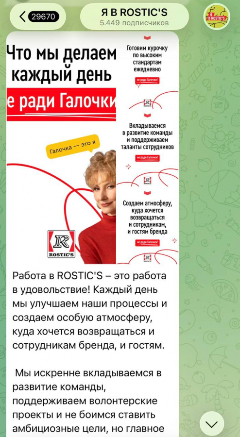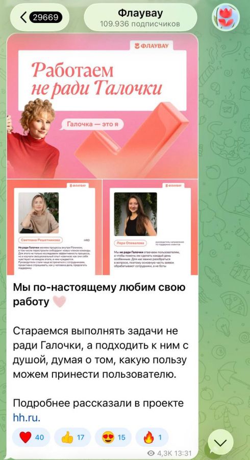 Идею коммуникации уже поддержали многие бренды и устроили масштабный СММ-флешмоб, к которому присоединились порядка 17 компаний — и этот список продолжает расти. Партнеры поддержали главную мысль и встроили ее в собственные коммуникации, рассказали, что в их компаниях действительно делают не ради галочки. Среди участников флешмоба — «Сбер», Flowwow, «Литрес», «МегаФон», ROSTIC’S, «Альфа-Банк», Setters, «Перекресток», «Пятёрочка», ГК «Рики» и «Смешарики», VK, МТС, «Циан», One Price Coffee.
