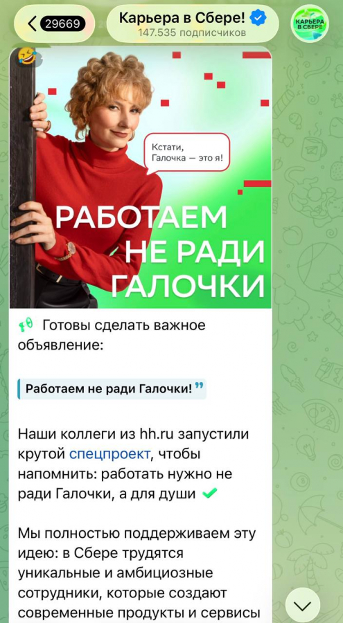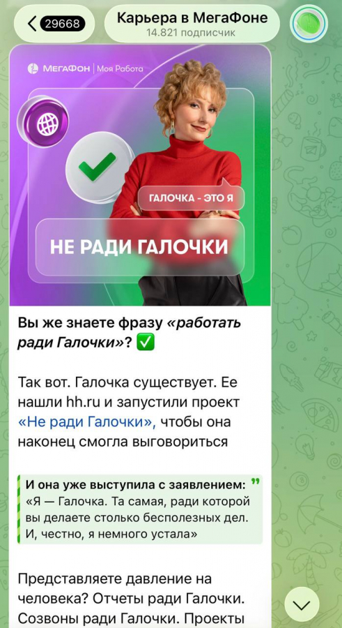 Центральным образом серии видеороликов hh᎐ru стала Галочка — персонаж, в котором собраны все бессмысленные задачи, отчеты и процессы, выполняемые «потому что так надо». Вместо привычного рекламного сообщения hh.ru предложил аудитории культурный манифест: перестать работать ради формальности и задуматься над тем, что они делают не ради Галочки.