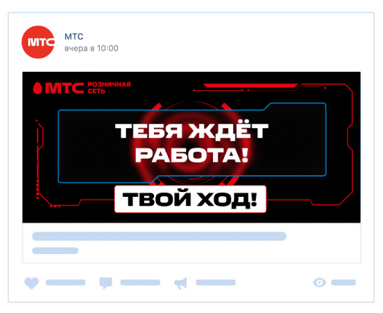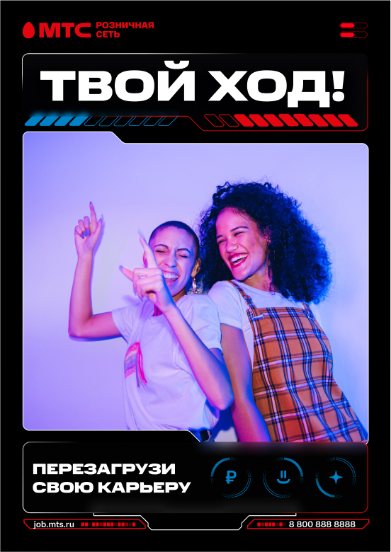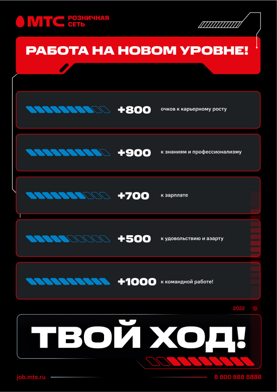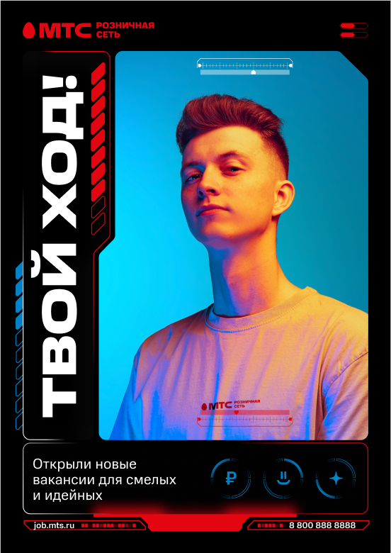 В этом блоке дополнительной задачей была визуальная отстройка от основного цвета МТС — мы сохранили ключевой красный, но ушли в более тёмную тему, добавив голубой цвет. Он также выступает как отличительный цвет именно для HR-бренда и показывает, что коммуникация ведется не от маркетингового бренда.